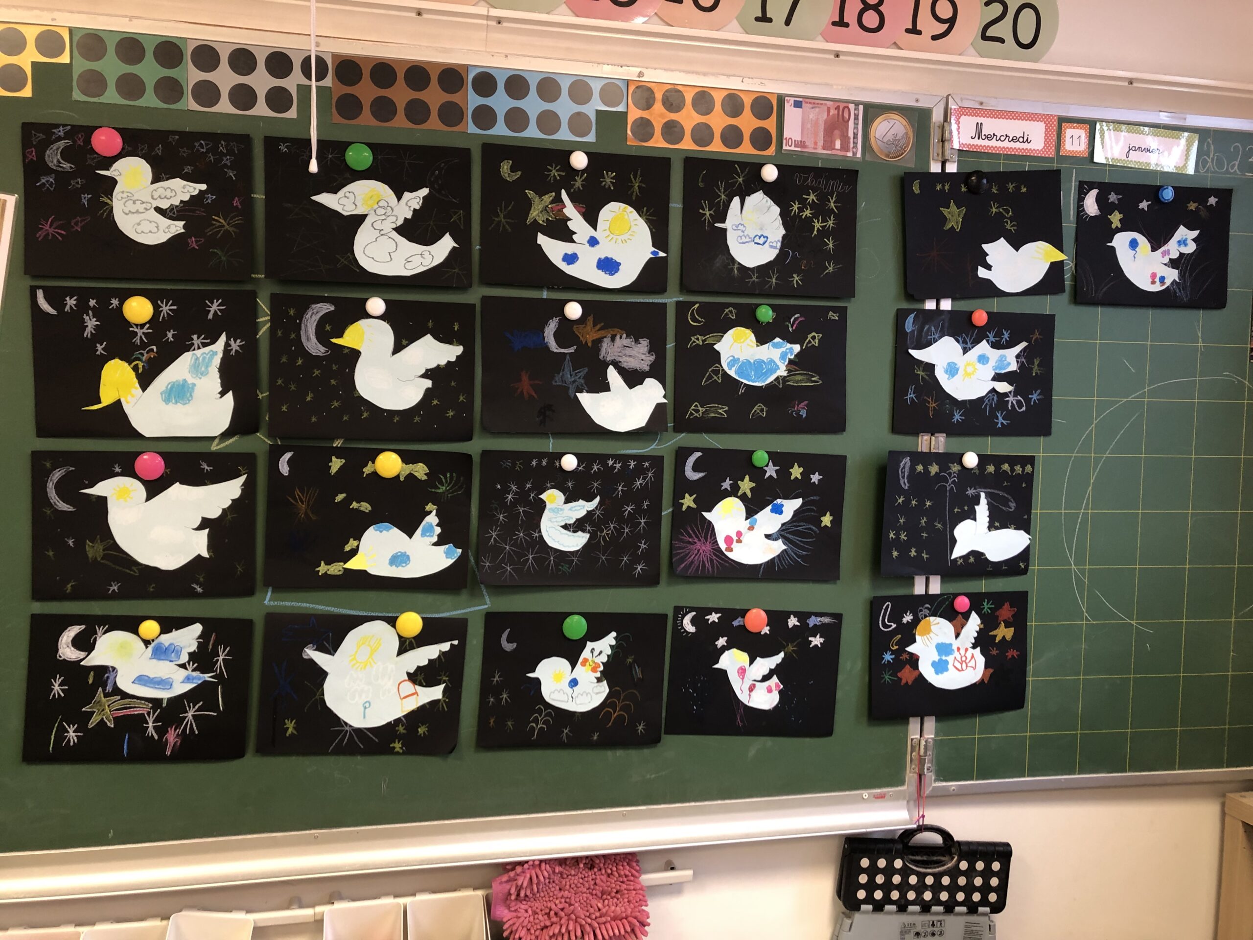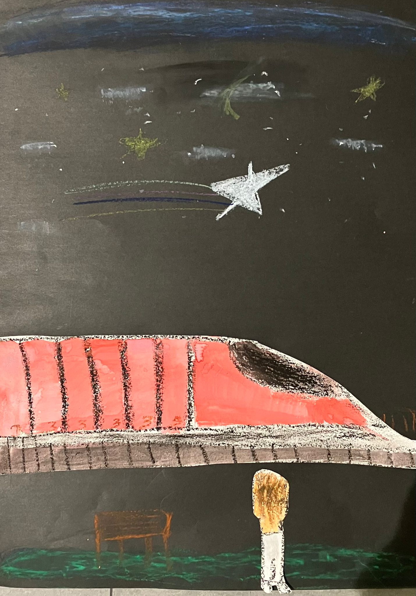Sur la feuille noire, ils dessinent aux pastels le monde de la nuit : feux d’artifices, étoiles, lune, débarquement de martiens, planètes, fusées… En fin de dessin, on peut leur donner des brillants autocollants ou des paillettes.